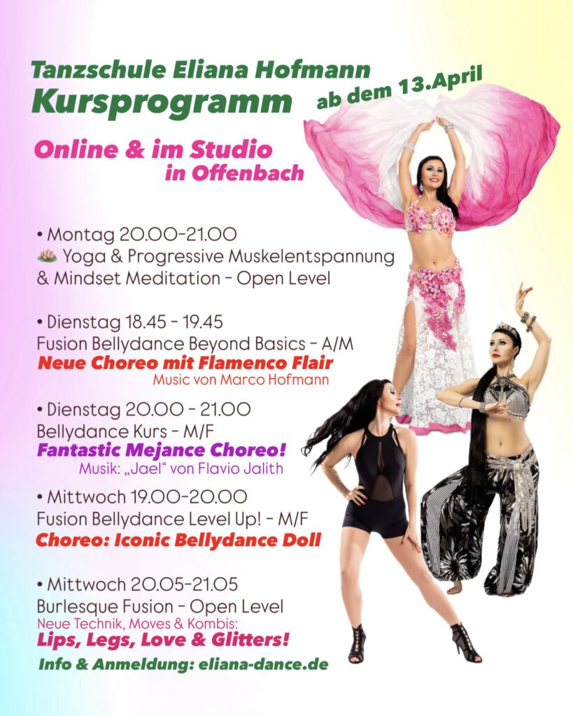 Mein Name ist Eliana Hofmann, ich bin Diplompädagogin (RU), Tanzpädagogin für Orientalischen Tanz, Tribal Fusion Bellydance, FCBD® Style, Pre Ballett und Ballett, Yoga & Fitness Trainerin und Ernährungscoach.