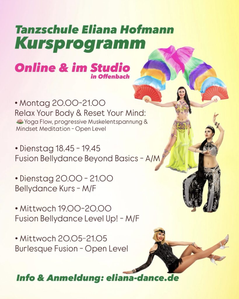 Mein Name ist Eliana Hofmann, ich bin Diplompädagogin (RU), Tanzpädagogin für Orientalischen Tanz, Tribal Fusion Bellydance, FCBD® Style, Pre Ballett und Ballett, Yoga & Fitness Trainerin und Ernährungscoach.
