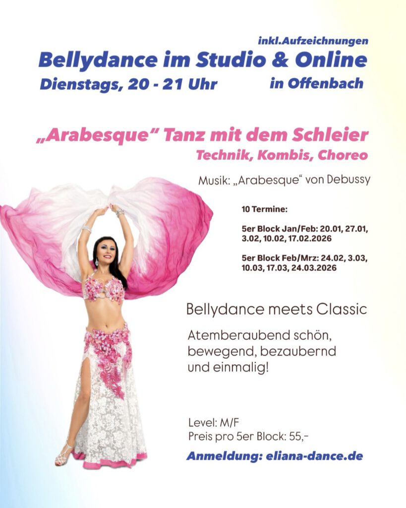 Thema im Jan/Feb und Feb/Mrz: „Arabesque“ Choreografie – Bellydance mit dem Schleier zur klassischen Musik von Debussy! Atemberaubend schön, bewegend, bezaubernd und einmalig! Musik: „Arabesque“ von Debussy