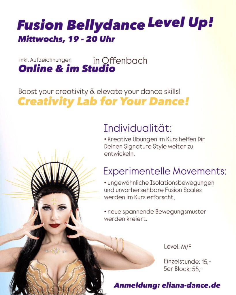 Kreative Tanzstunden für motivierte Tänzerinnen! Kursinhalte: interessante Übungen und Aufgaben um Deine Kreativität anzuzünden, Fusion Bellydance Technik Drills, Improvisation, Ausdruck, Bühnenpräsenz , neue exklusive Fusion Tanzkombis und mehr! Yoga-Pilates Warm Up, Stretch & Relax Cool Down für Tänzerinnen. Sei dabei und profitiere vom wertvollen Unterricht mit Eliana!
