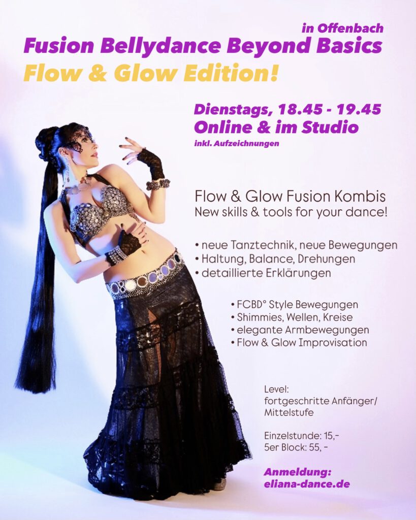 Thema im Jan/Feb und Feb/Mrz: Flow & Glow Edition! Neue Technik Skills und Tools für Deinen Tanz! Auf dem Programm stehen Fusion Bellydance Undulations=Wellen, Layering, Fusion Lock & Pops, Shimmy Drills, Turns sowie tänzerische Flow & Glow Kombis und Improvisation mit Augenmerk auf Haltung und Präsenz!